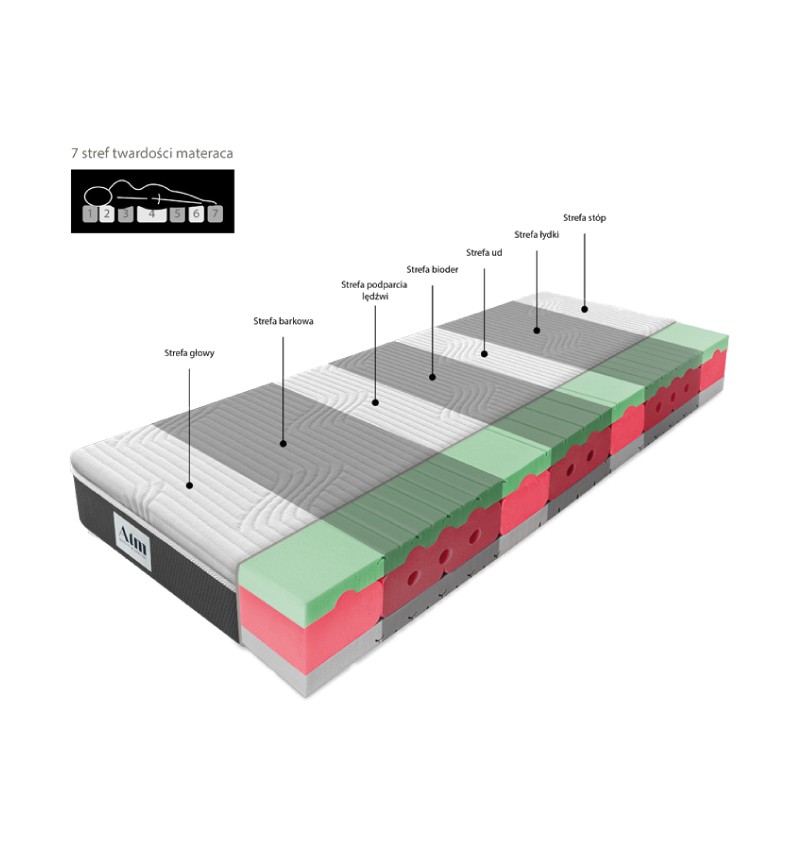Siedem stref twardości - materac posiada 7 zróżnicowanych stref twardości, które umożliwiają optymalne dopasowanie się jego wkładu do budowy anatomicznej użytkownika, zapewniając doskonałe podparcie całego ciała w czasie snu.