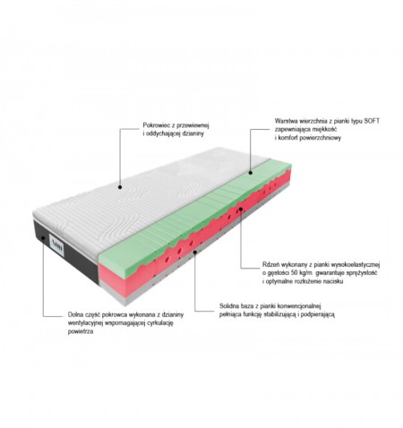 Pianka wysokoelastyczna - materiał o wysokiej sprężystości, wytrzymałości i odporności na odkształcenia, zapewnia stabilne podparcie dla kręgosłupa doskonale dopasowując się do ciała użytkownika. Stosunkowo lekki, dzięki czemu przewracanie materaca nie wymaga dużego wysiłku.