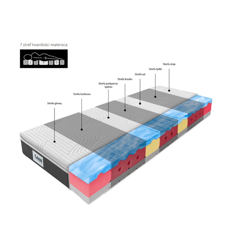Siedem stref twardości - materac posiada 7 zróżnicowanych stref twardości, które umożliwiają optymalne dopasowanie się jego wkładu do budowy anatomicznej użytkownika, zapewniając doskonałe podparcie całego ciała w czasie snu.