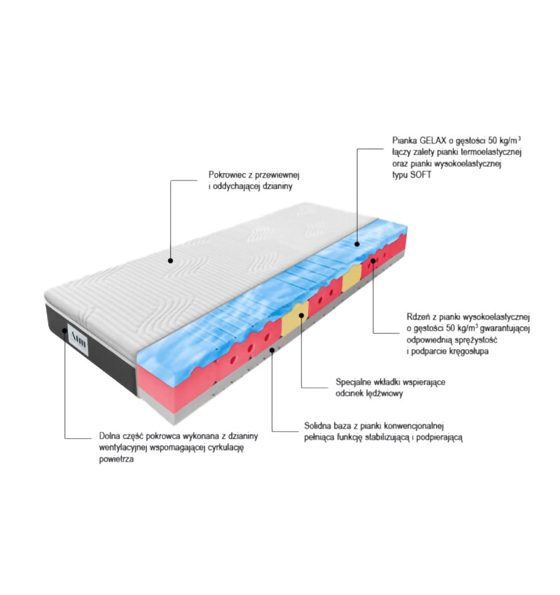 Za wyjątkowe odczucie komfortu odpowiada wierzchnia warstwa z innowacyjnej pianki GELAX o gęstości 50 kg/m³ – hybrydy łączącej cechy pianki termoelastycznej i wysokoelastycznej (SOFT) oraz efekt chłodzenia. Materac delikatnie otula ciało, a jednocześnie nie powoduje uczucia „zapadania się”, ponieważ pianka Gelax szybko wraca do pierwotnej formy i zachowuje sprężystość. Jej otwartokomórkowa struktura wspiera wentylację, a właściwości chłodzące sprawiają, że powierzchnia materaca praktycznie się nie nagrzewa i pozostaje neutralna termicznie przez całą noc.