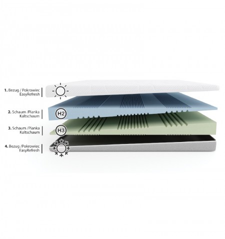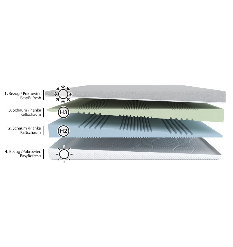 - 2 profilowane warstwy 7-strefowej pianki wysokoelastycznej Kaltschaum o twardości H2 i H3
